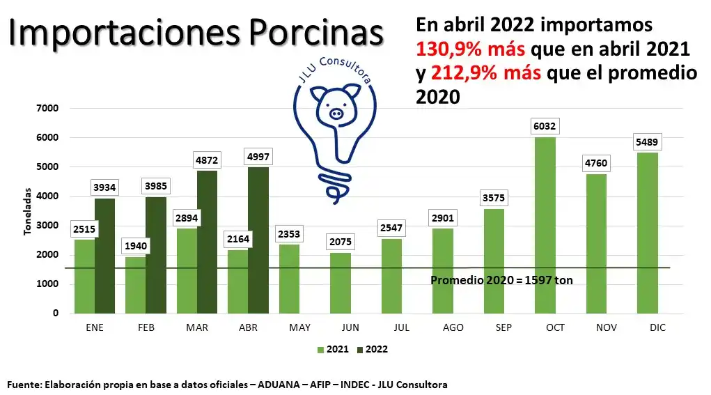 En la nota se indicó que en el primer cuatrimestre de 2022 ingresaron a nuestro país unas 19.600 toneladas de cortes de carne porcina, lo que implica un aumento del 106% con respecto al mismo período de 2021 y un 210% con respecto a 2020. Así, las importaciones sumaron 49,7 millones de dólares.