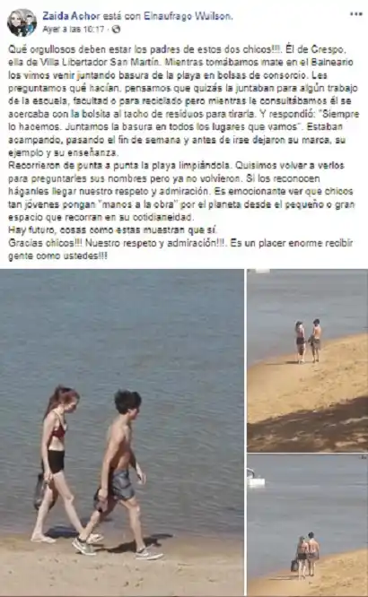 «Qué orgullosos deben estar los padres de estos dos chicos», escribió Zaida Achor, quien fue la encargada de publicar imágenes de los jóvenes, en las que se los ve con una bolsa de consorcio en sus manos, recorriendo la orilla.