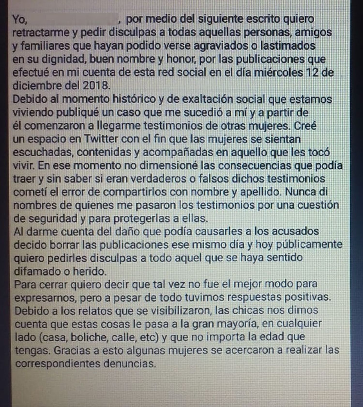 “Debido al momento histórico y de exaltación social que estamos viviendo, publiqué un caso que me sucedió a mí y a partir de él comenzaron a llegarme testimonios de otras mujeres. Creé un espacio en Twitter con el fin de que las mujeres se sientan escuchadas, contenidas y acompañadas en aquello que les tocó vivir. En ese momento no dimensioné las consecuencias que podría traer, y sin saber si eran verdaderos o falsos dichos testimonios cometí el error de compartirlos con nombre y apellido. Nunca di nombres de quienes me pasaron los testimonios, por una cuestión de seguridad y para protegerlas a ellas.