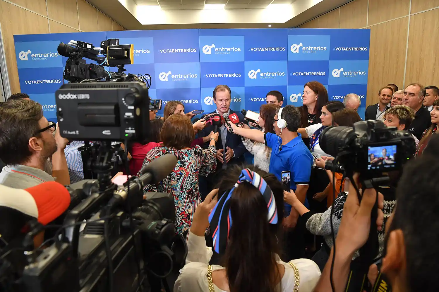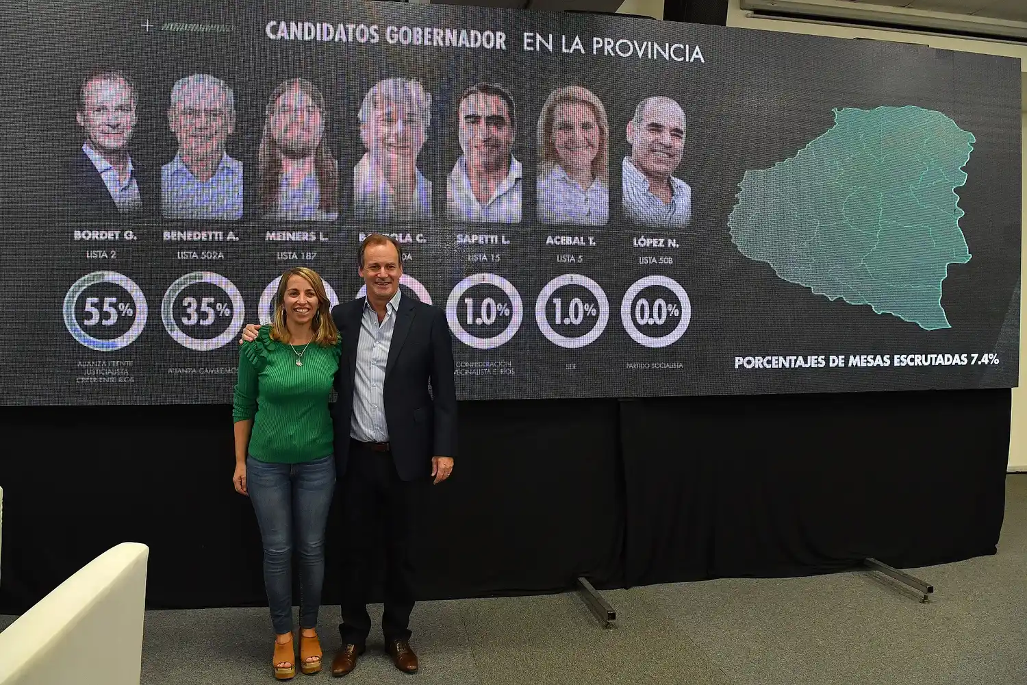 Minutos antes de las 21.30 del domingo 14 de abril, el gobernador Bordet y su compañera de fórmula, Laura Stratta, llegaron al Centro Provincial de Convenciones donde se conocieron los primeros datos oficiales. Lo primero que hizo fue celebrar la afluencia de votantes que alcanzó el 80 por ciento.