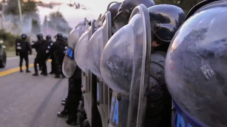 Equipos tácticos, unidades antitumulto y reparticiones especiales de distintas fuerzas participaron del desalojo en la ciudad rionegrina. También se vio un helicóptero perteneciente a la Policía Federal Argentina (PFA), cuya presencia en la zona es inédita.