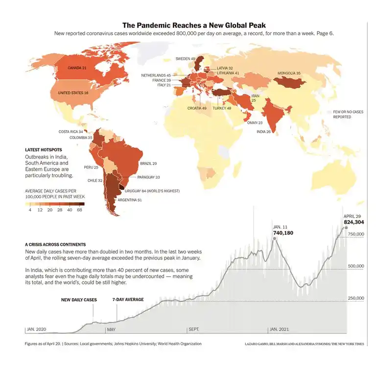 India, hoy el país con mayor atención mediática por las trágicas imágenes de colapso sanitario también figura en el mapa, con una tasa de 26 infecciones por cada 100.000 habitantes en los últimos siete días. Si bien no aparece en el mapa como uno de los casos más preocupantes, el NYT sí explica que la India también está impulsando este nuevo pico mundial. Detalla que allí, la media móvil de siete días de nuevos casos diarios en el país superó los 357.000 el jueves pasado, lo que supone un aumento de más de cinco veces desde el 1 de abril. Y revela que el país representa ahora más del 40% de los nuevos casos del mundo. Lo más preocupante, advierte el artículo, es que estas sombrías cifras pueden estar infravaloradas.
