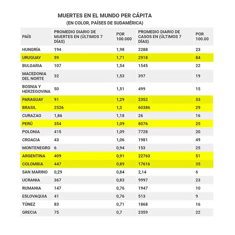Además de la crisis en Uruguay y Argentina, Paraguay, Brasil, Perú y Colombia se encuentran entre los 20 primeros países del mundo en cuanto a muertes por Covid per cápita.