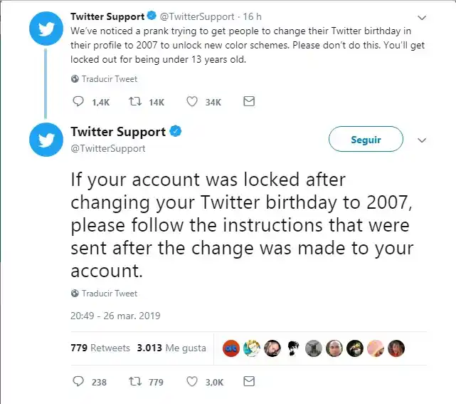 Aunque no está claro cuánta gente ha caído en la broma, debe ser un número significativo como para que la red social ya haya tomado cartas en el asunto. Tras lanzar la primera advertencia, Twitter ha publicado que, en caso de haber cambiado la fecha de cumpleaños a 2007, hay que seguir las instrucciones que está enviado sobre cómo desbloquear la cuenta. Sin embargo, no especifica cuáles son esas instrucciones ni a dónde las está enviado.