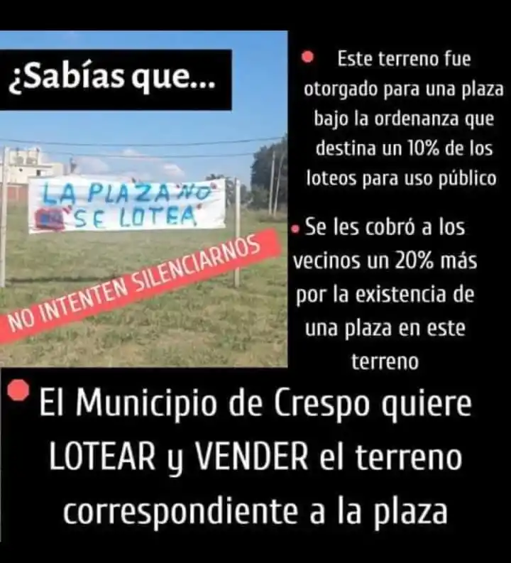 Los vecinos quieren su plaza, y no viviendas en ese punto del catastro municipal; y quieren se resuelva esta colisión de derechos entre los que necesitan un lote de bajo costo para construir su casa y quienes pagaron una diferencia por su terreno con la promesa de la plaza que tendrían enfrente o cerca de donde hoy viven, tal cual consta en el anteproyecto de loteo y lo prometieron los propietarios del mismo.