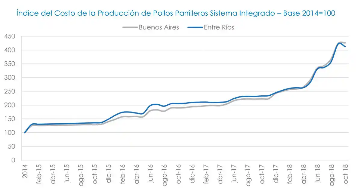 Vale decir que en la información compartida desde la Secretaría nacional se destaca que el Índice del Costo de la Producción de Pollos Parrilleros en Buenos Aires correspondiente al mes de octubre de 2018 registró una suba de 91,3% en relación con el mismo mes de 2017.