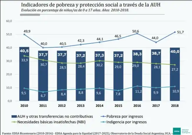 La medición arroja que en 2018 la pobreza monetaria en la infancia y adolescencia alcanzó al 51,7% y es la cifra más elevada de la década. En tanto, se estima que 10,2% son indigentes. Es decir, que en el último período interanual se incrementó la pobreza infantil pasando del 48,1% al 51,7%, según las estimaciones de la EDSA.