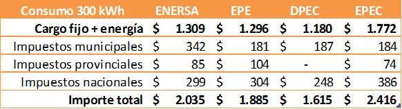 Para el caso de un usuario residencial con un consumo de 300kWh por bimestre, es decir la potencia consumida por gran parte de las familias de Entre Ríos, la facturación total de febrero superó los $2.035 y el costo puro de la electricidad fue de $1.309. Esto implica que la carga impositiva sobre tarifa pura de energía representó el 55%.