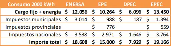 «En cuanto a la carga tributaria, los diferentes tramos tarifarios en nuestra provincia superan el 50% del costo de la electricidad, lo que significa un nivel 10% superior al resto de la región examinada. La mayor diferencia se da por las tasas municipales sobre el consumo eléctrico que superan en más del 100% al resto de las provincias analizadas. Siendo Corrientes la que tiene los valores y componente impositivo más bajos de las cuatro provincia comparadas», señala el informe.