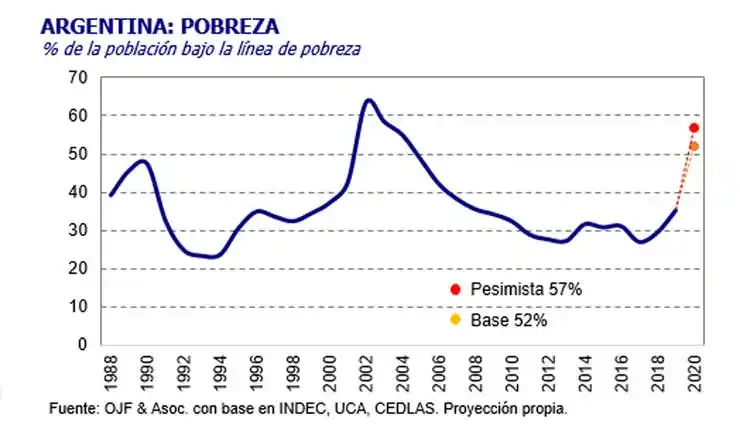 Básicamente, con los supuestos de variación del PIB que significan un desempleo de 14.5% o en el caso más extremo de 16,5% del desempleo sobre la población económicamente activa. También el salario real podría caer, en mayor o menor medida, según los escenarios de la actividad económica. Entonces ¿Qué significa la pobreza? En el caso más probable, de caída del PIB de 13%, indican las proyecciones una pobreza de 52% sobre la población para el cuarto trimestre de 2020. En el caso de mayor caída del PIB (16,5%) que es poco probable, nos indica una pobreza de 57% del total de la población. Esto significa que a fin de año, de cada 2 personas, una sería pobre, según las definiciones del Instituto Nacional de Estadísticas y Censo (Indec).
